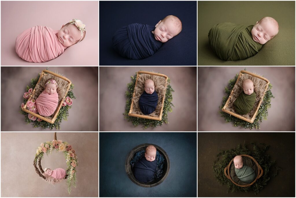 I got to start off 2023 with a bang by photographing my very first set of TRIPLETS! I would be lying if I said I wasn’t a little bit intimidated to work with three tiny little ones but they couldn’t have been any sweeter for me! Mom requested a specific color for each baby – pink for Katherine, blue for Henry, and Green for Foster so I incorporated those colors throughout. We also, of course, did some classic neutral setups for them. We stuck with mainly swaddled shots to make sure they were all nice and cozy but we did slip them into little fuzzy footed pajama outfits at the end. And let me tell you…they have a gorgeous big sister who is absolutely smitten with them! It was way to hard to narrow down to the amount I share on here so I chose some of them together and individually…..