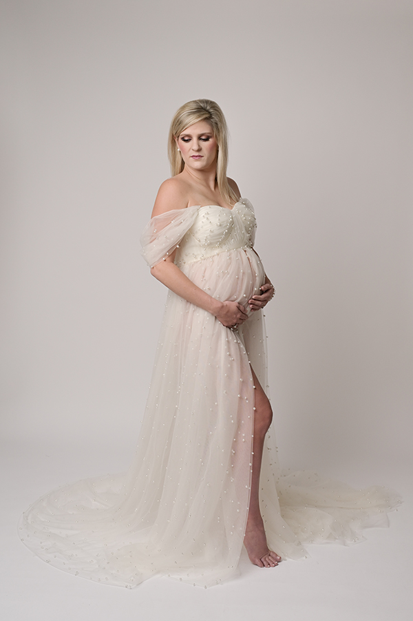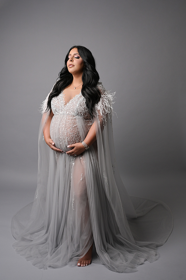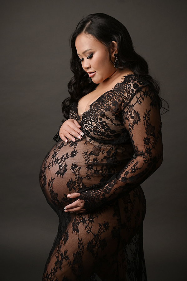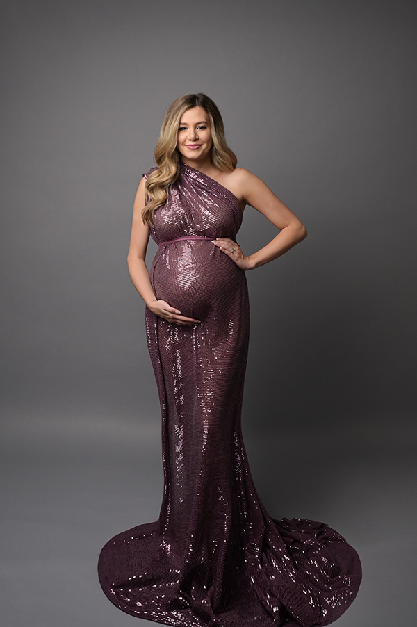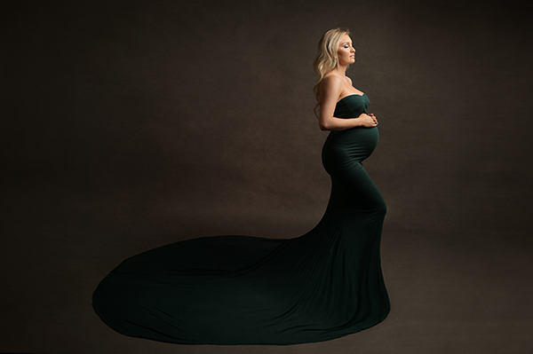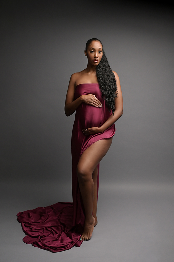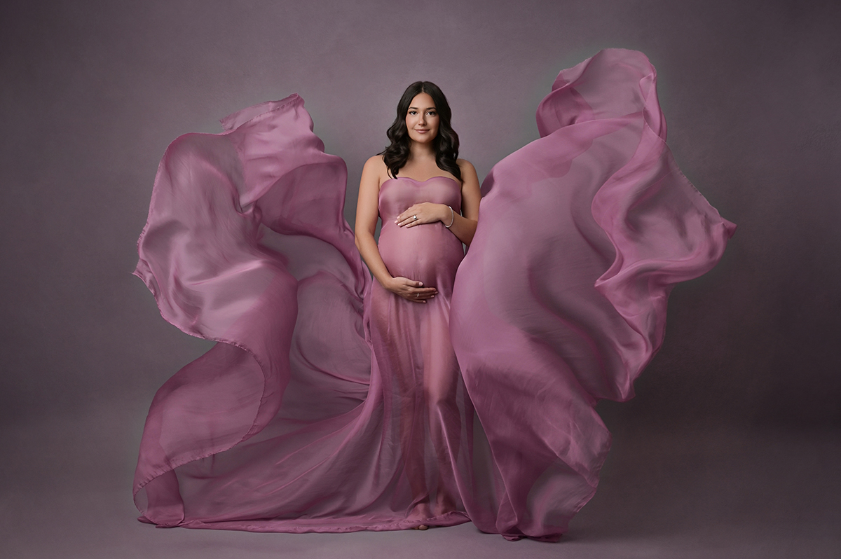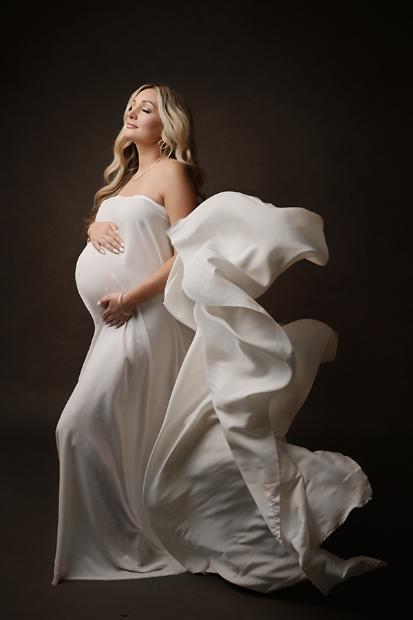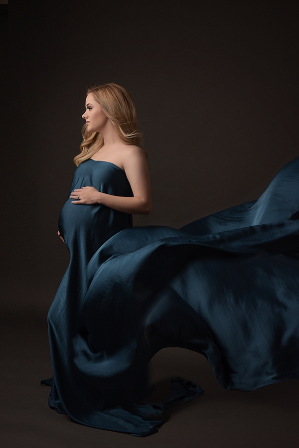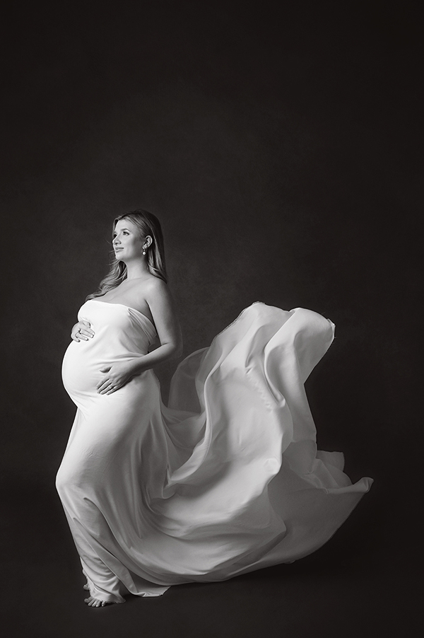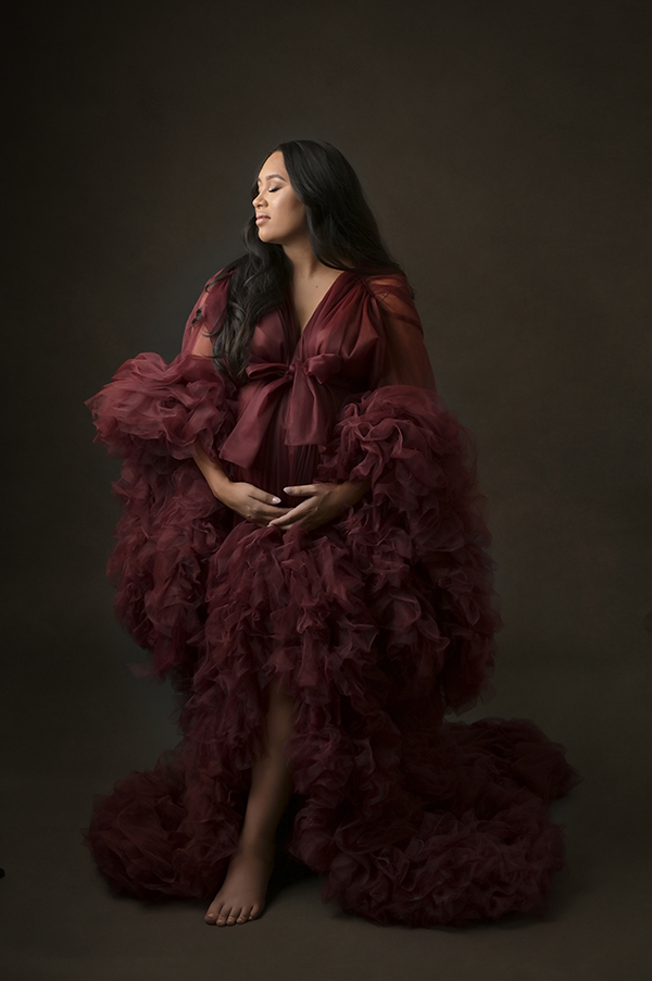 All maternity portraits are created in-studio using carefully selected gowns, glamourous textiles, and controlled lighting to ensure consistency across the gallery. This approach allows each image to stand out as a beautifully created piece on it’s own.