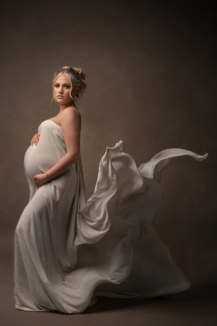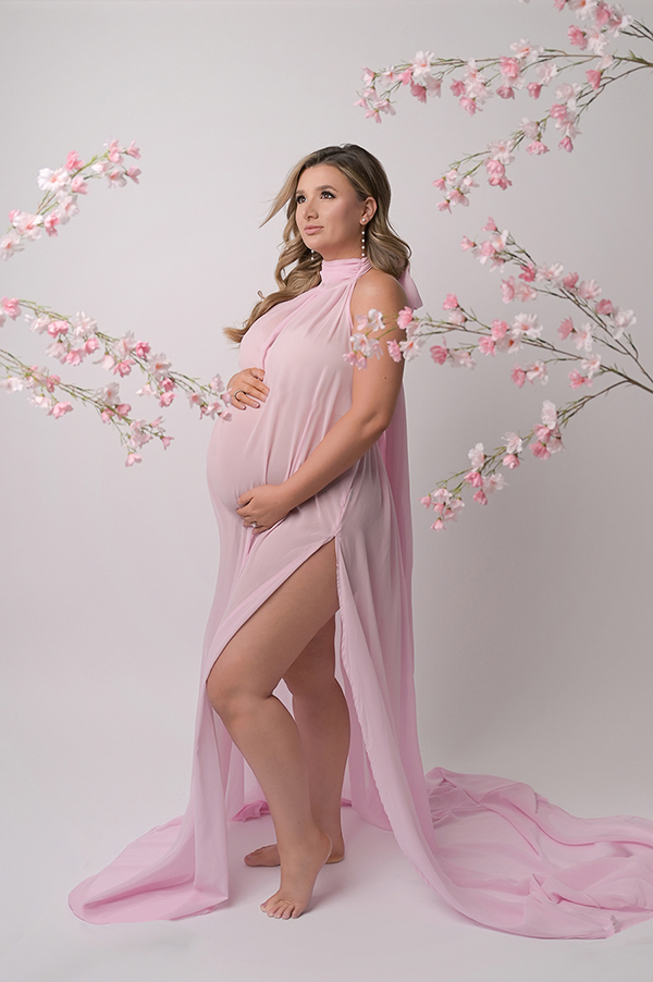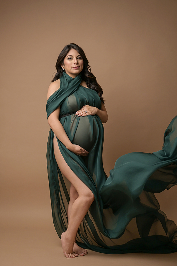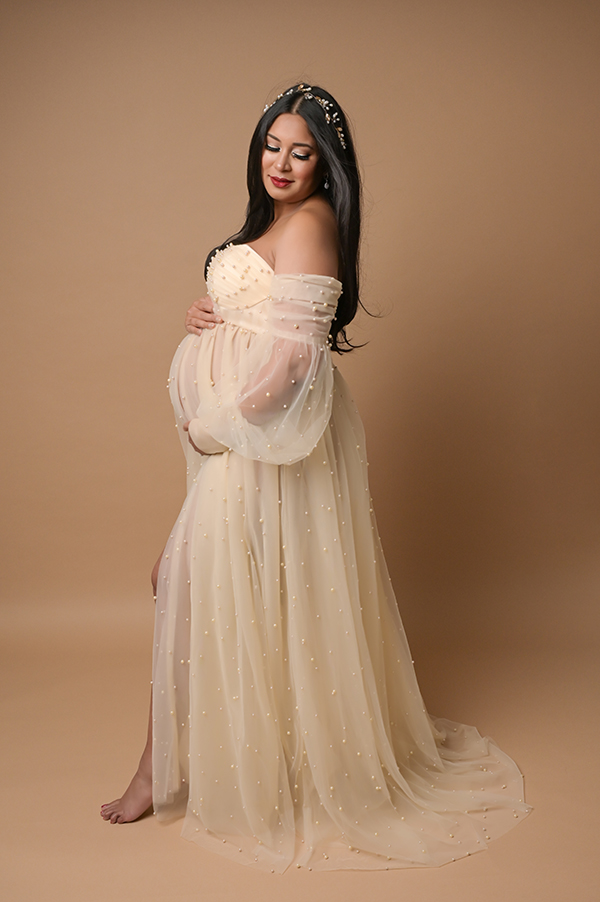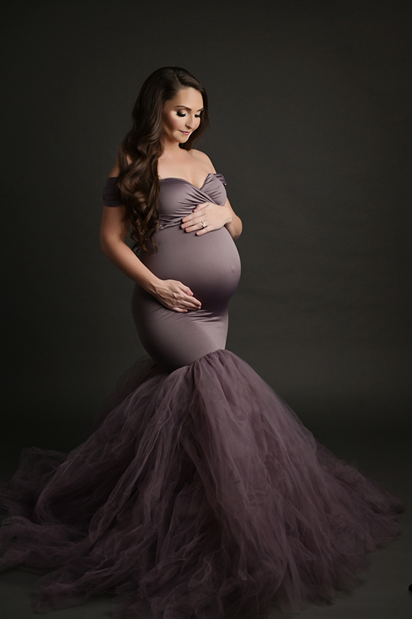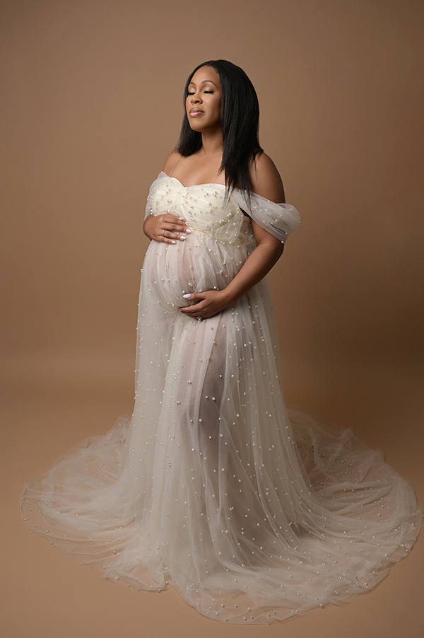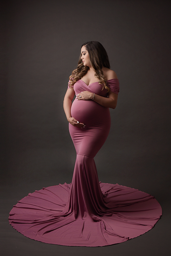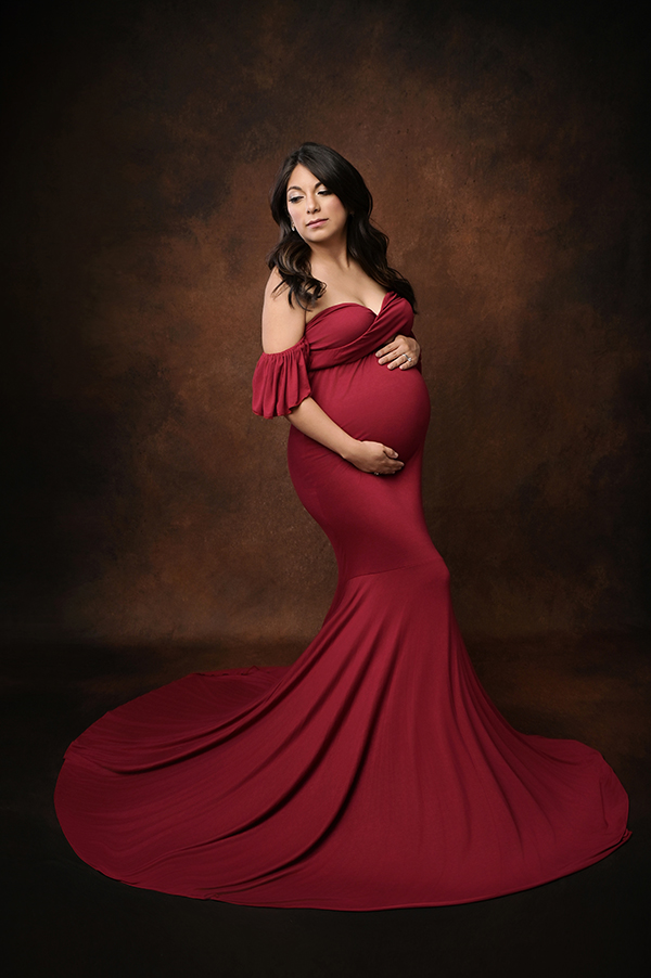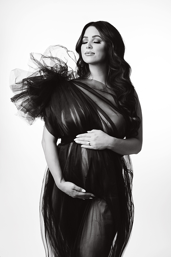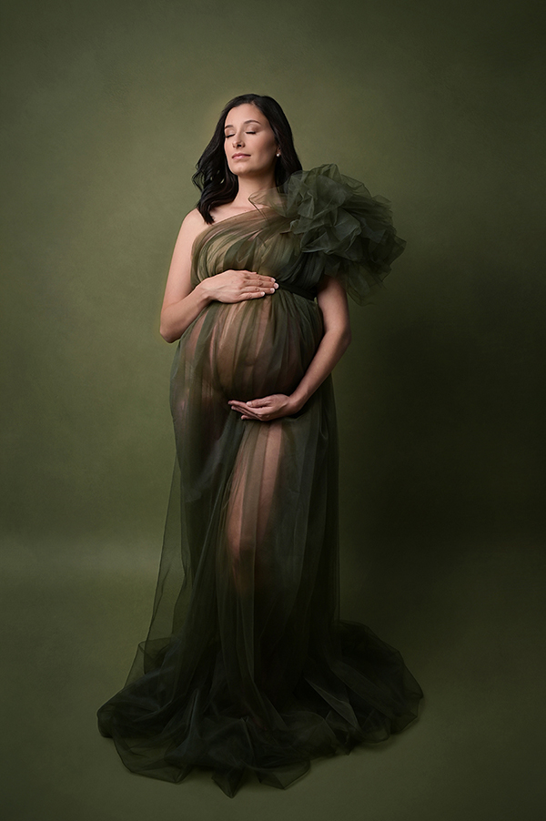 All maternity portraits are created in-studio using carefully selected gowns, glamourous textiles, and controlled lighting to ensure consistency across the gallery. This approach allows each image to stand out as a beautifully created piece on it’s own.