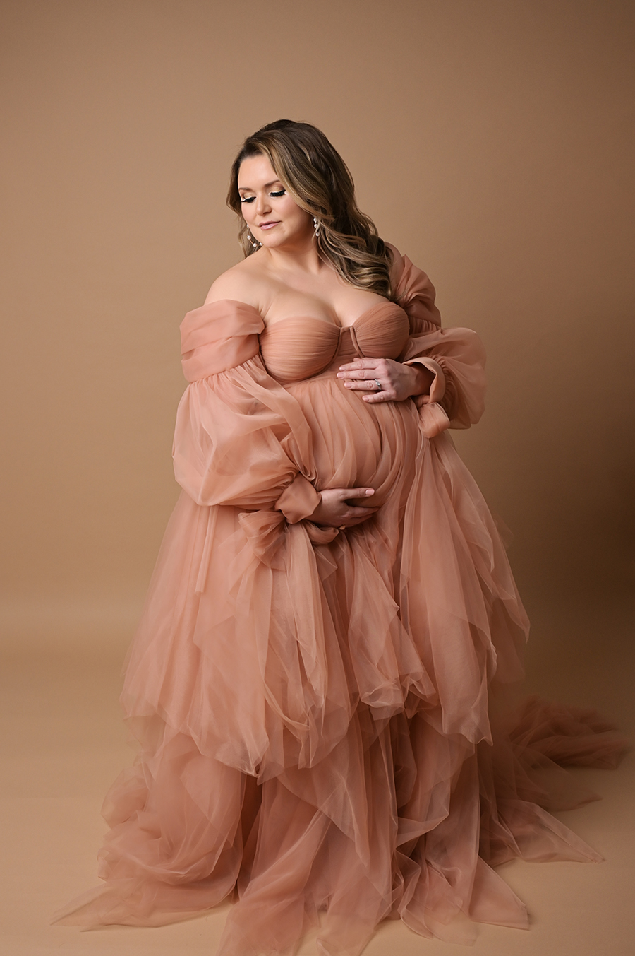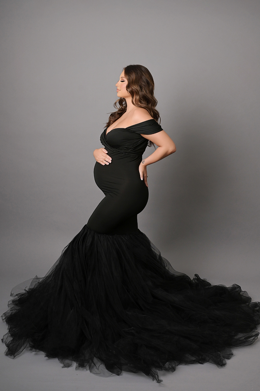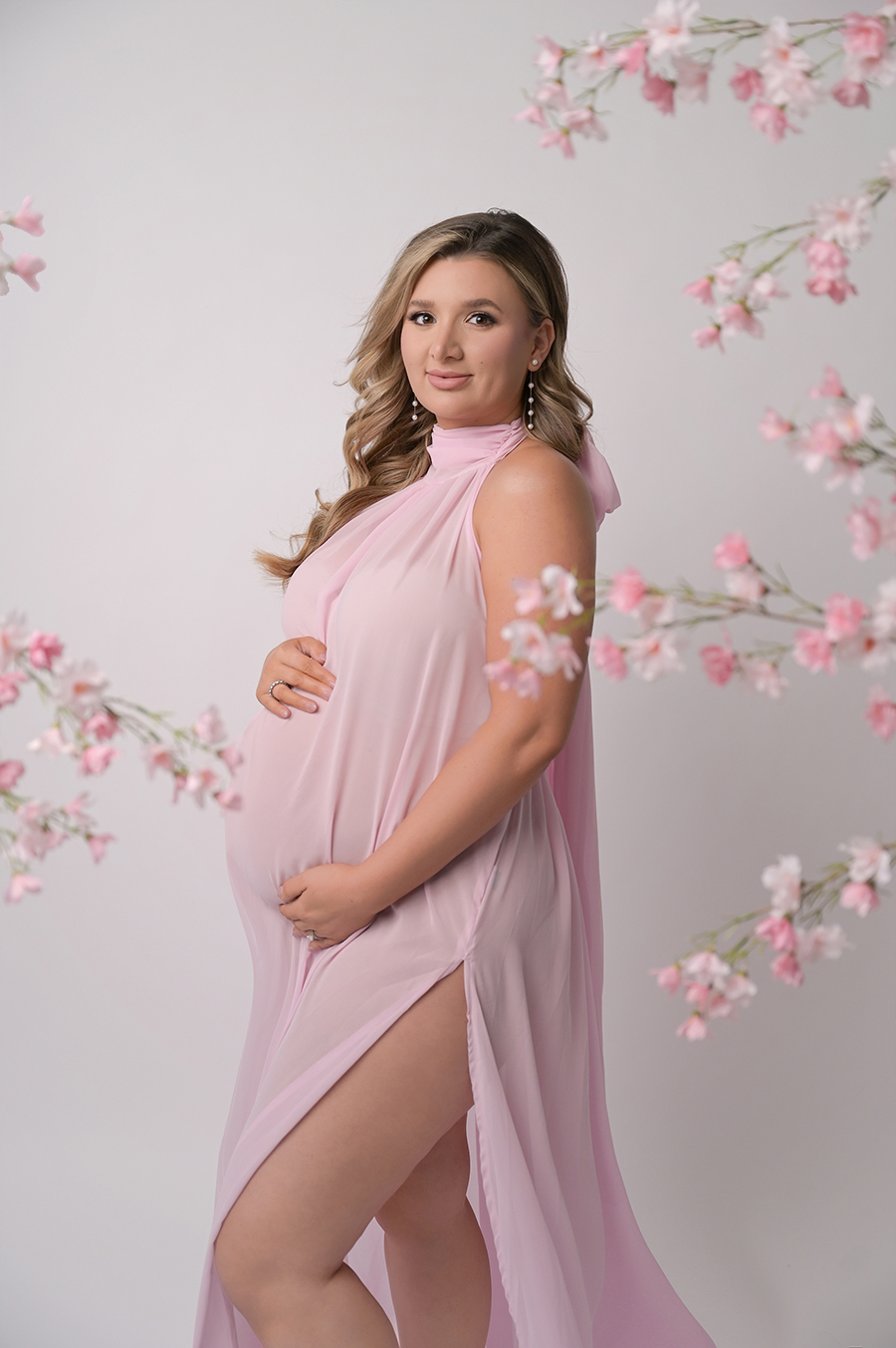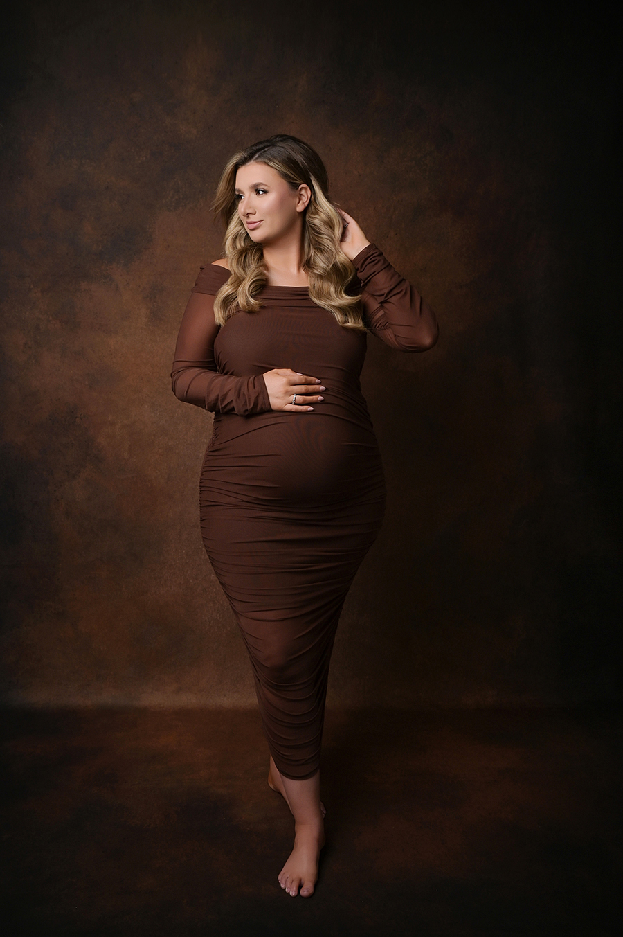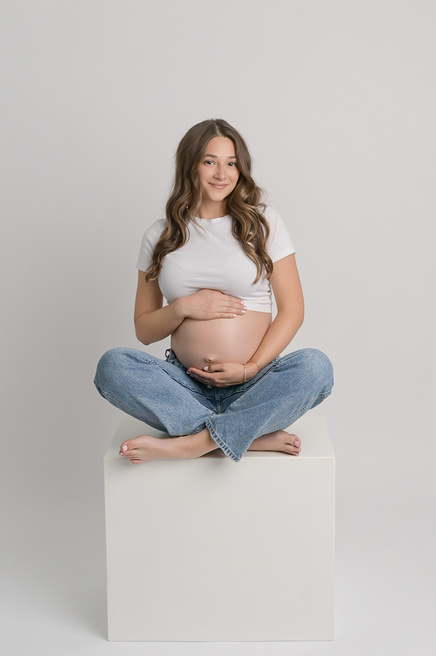 All maternity portraits are created in-studio using carefully selected gowns, glamourous textiles, and controlled lighting to ensure consistency across the gallery. This approach allows each image to stand out as a beautifully created piece on it’s own.