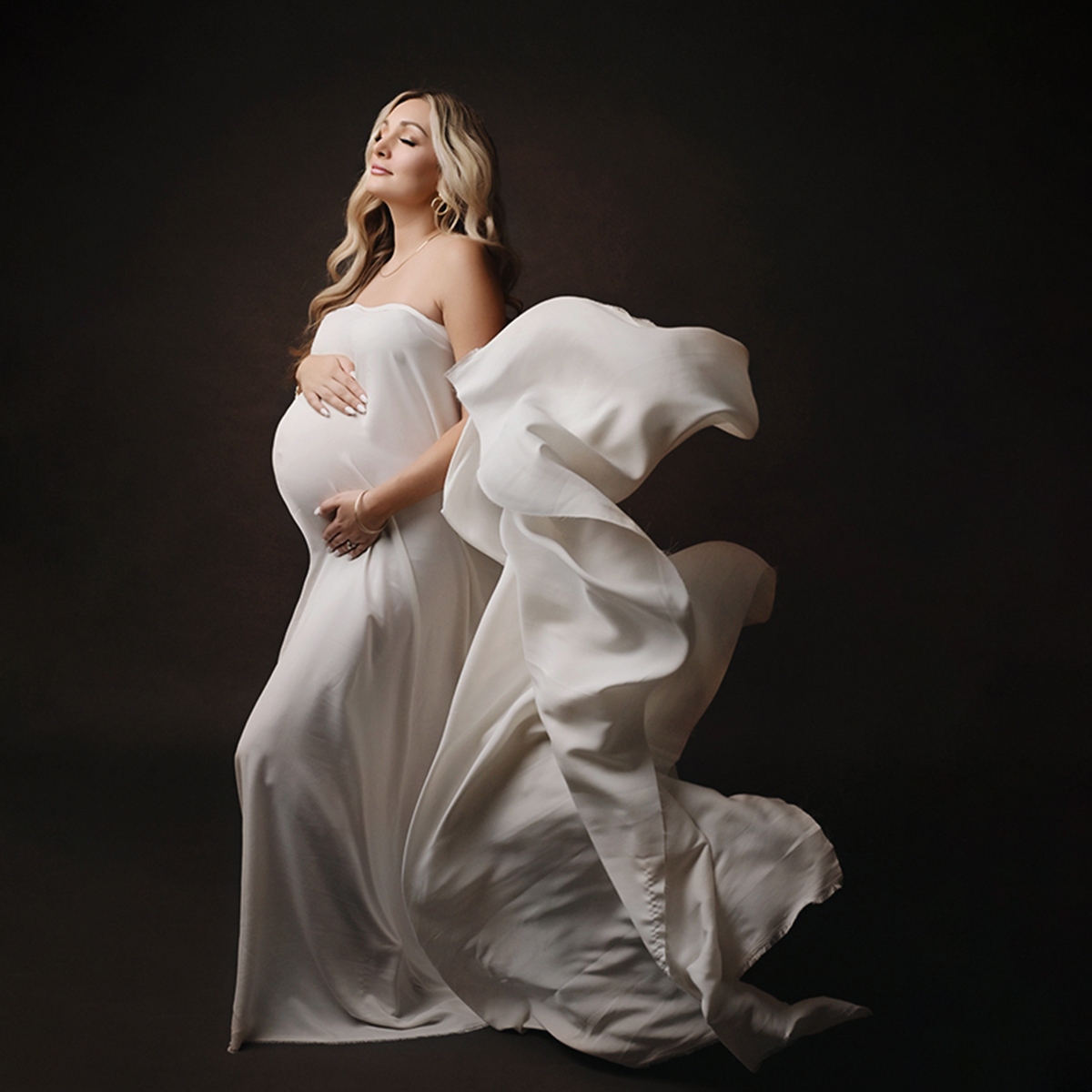 Booking during the beginning of your second trimester allows for more scheduling flexibility and also gives us plenty of time to plan and design a session that perfectly fits your vision. We have a variety of wardrobe options available, including fitted maternity gowns, lace robes, bodysuits, crop tops, and silk fabrics to accentuate your curves. You can view samples in the portfolio. Any items of your own may also be worn for the session. Our goal is to create portraits that show your personal style.